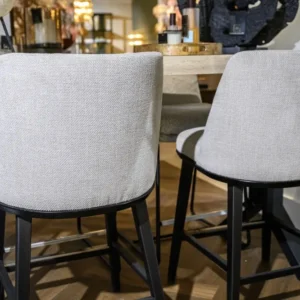 Een van de meest opvallende kenmerken van de Barkruk Henes is de verbluffende stofkeuze: de exclusieve Ontario Frog. Deze stof voelt niet alleen luxueus aan, maar straalt ook een subtiele elegantie. De diepe, rijke grijstint van de Ontario Frog stof geeft een vleugje frisheid en sereniteit aan de barkruk, terwijl het tijdloze ontwerp ervoor zorgt dat deze barkruk naadloos opgaat in verschillende interieurstijlen.