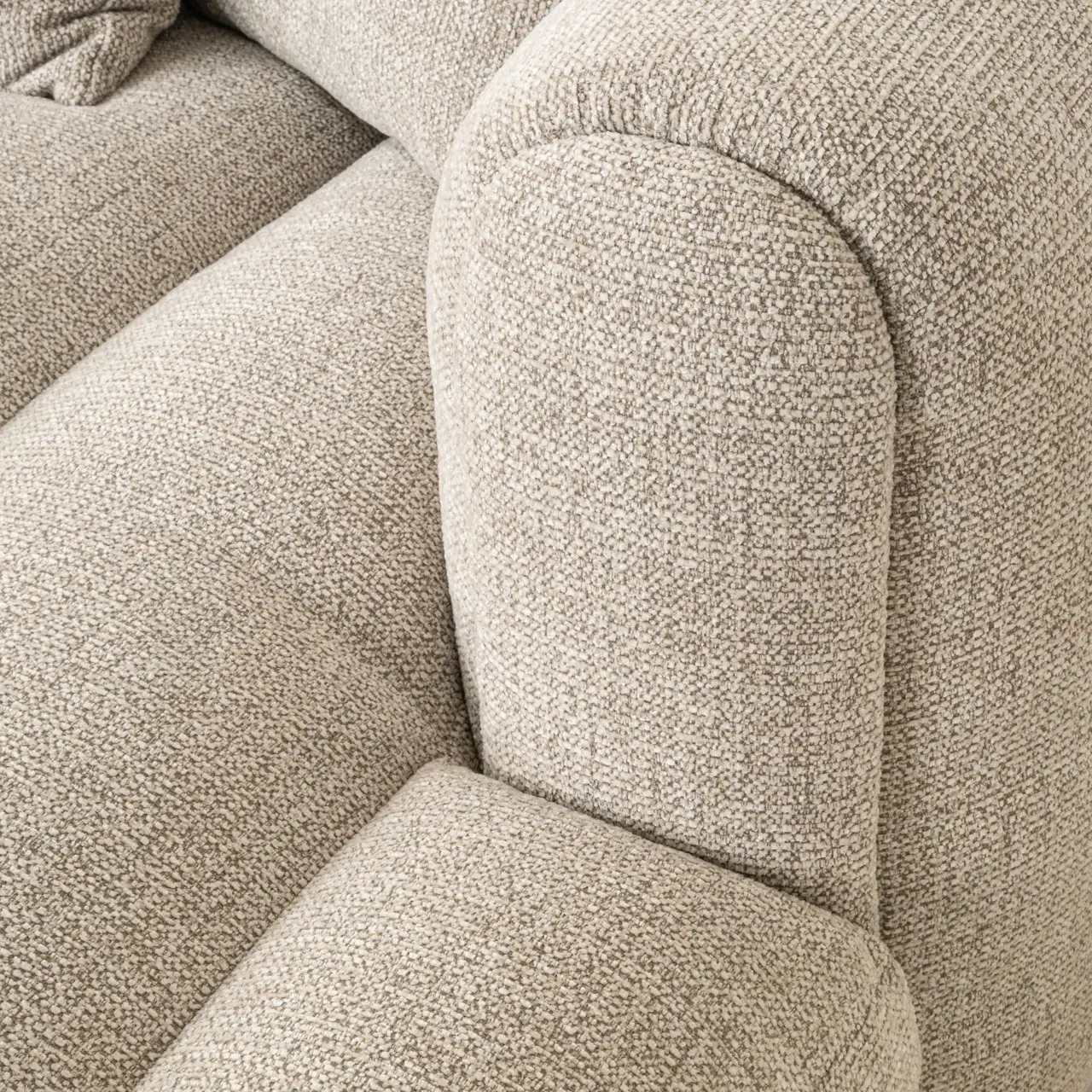 Deze sofa heeft een lage en ruime lounge-opstelling met een duidelijke hoekvorm, gespiegeld ten opzichte van de linkeruitvoering. De zitting en rugleuning ogen breed en comfortabel, met zachte belijning en een rustige uitstraling. De bekleding toont een lichte, natuurlijke kleurindruk met een matte textuur. Door de evenwichtige verhoudingen en het ingetogen ontwerp past de sofa goed binnen moderne en serene woonruimtes.