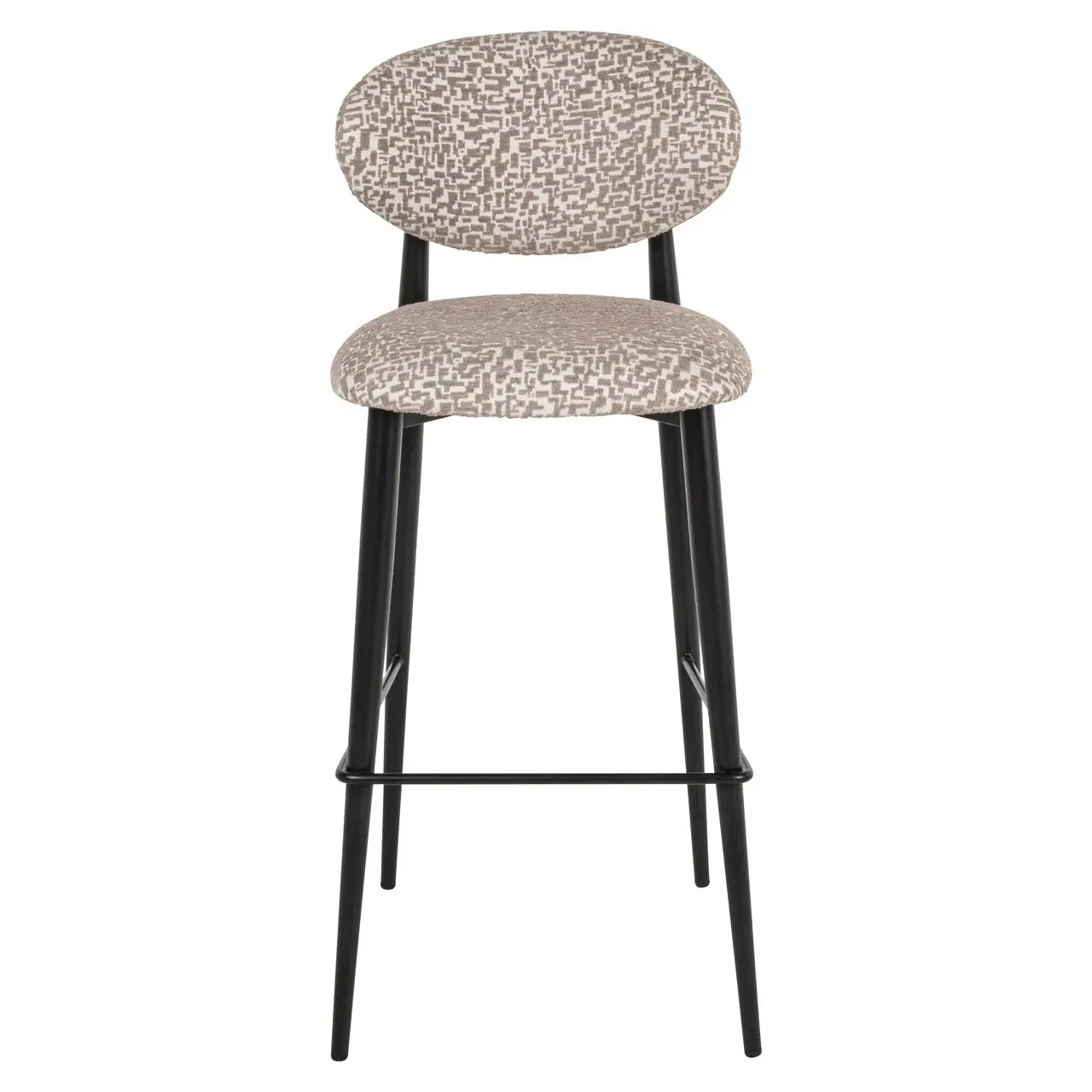 Barkruk Dantes combineert een zwart metalen frame met een open rugleuning in natural geo-stof. Brandvertragend en vol subtiel karakter. Ook verkrijgbaar in hazel.