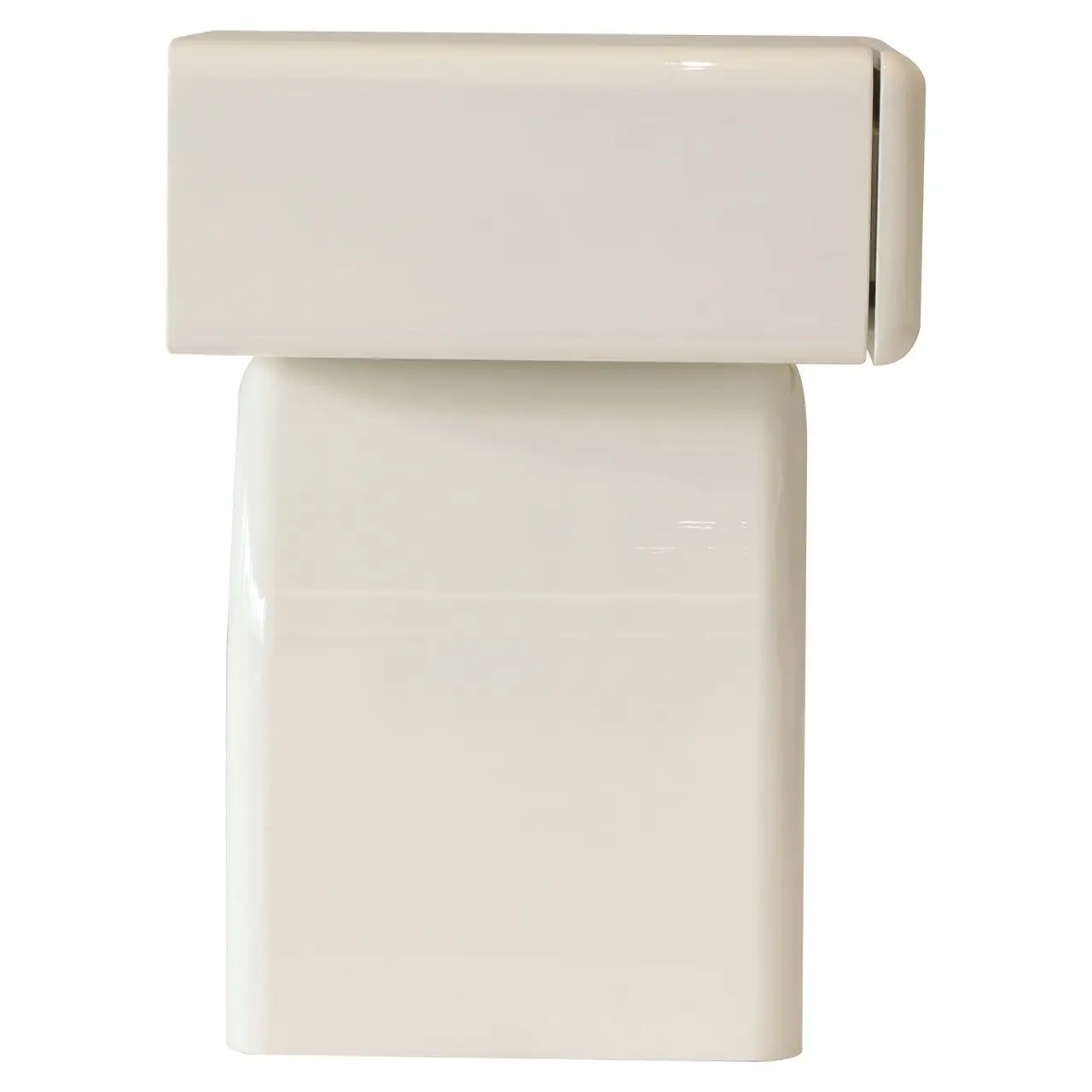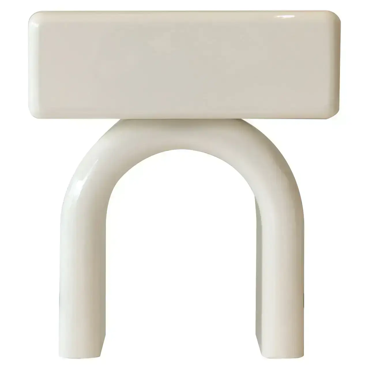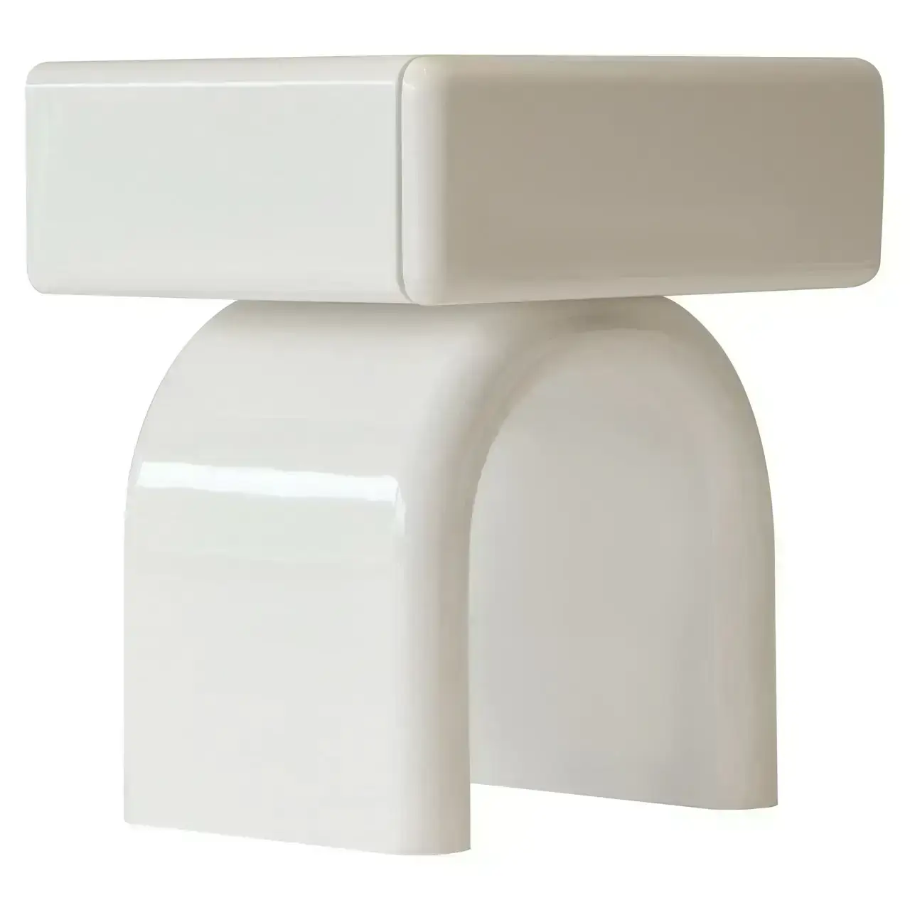 Deze bijzettafel heeft een compacte vorm met rechte lijnen en een gesloten uitstraling. Het ontwerp toont een duidelijk volume met een geïntegreerde lade, wat zorgt voor een rustige visuele indruk. De lichte kleur draagt bij aan een zachte en neutrale uitstraling in het interieur.