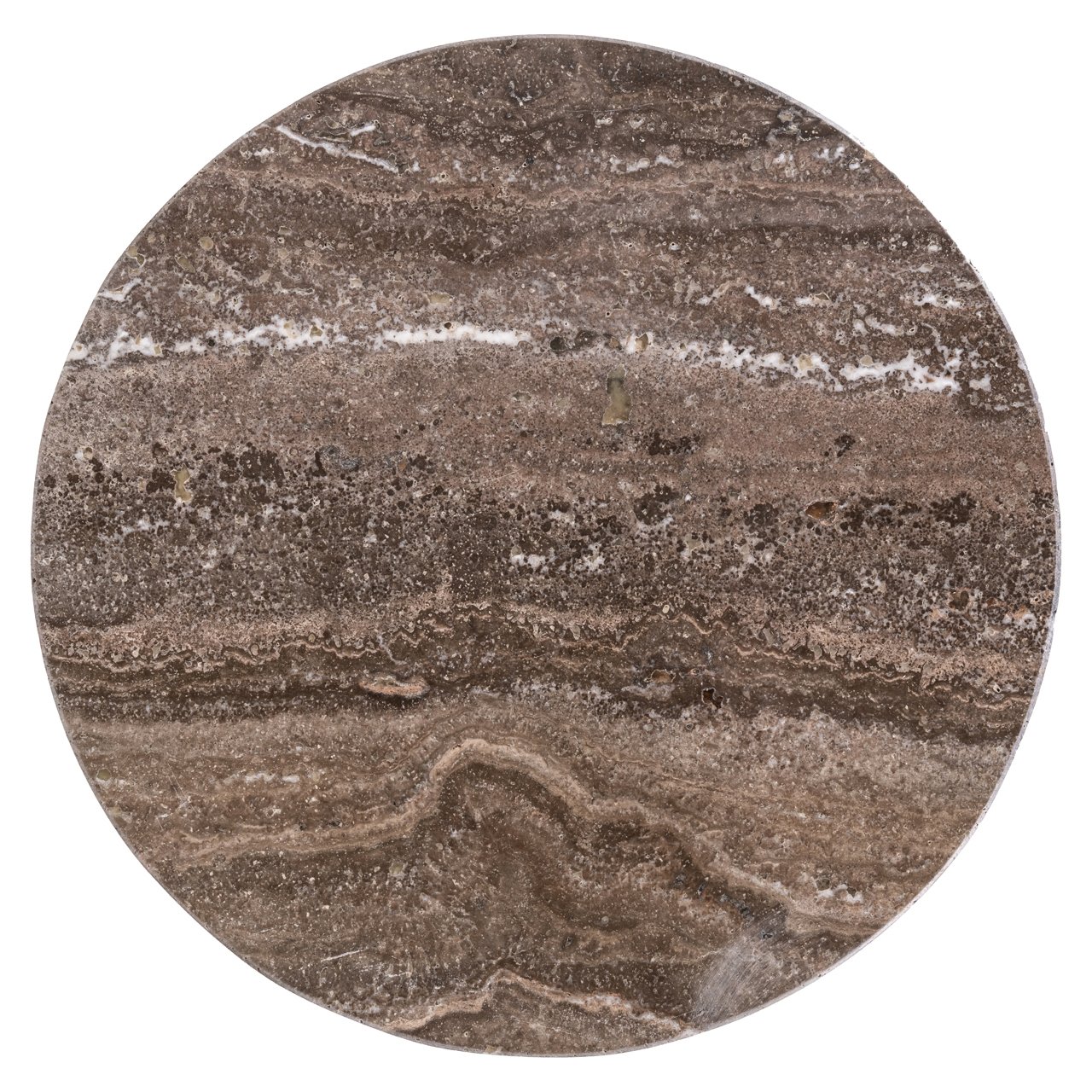 Deze bijzettafel heeft een ronde vorm met een compact silhouet. De afwerking toont een bronzen kleur met een zachte glans, wat zorgt voor een warme en rustige uitstraling. Door het eenvoudige en gesloten ontwerp is de tafel geschikt voor plaatsing naast een zitmeubel of fauteuil. De ronde belijning draagt bij aan een evenwichtig geheel.