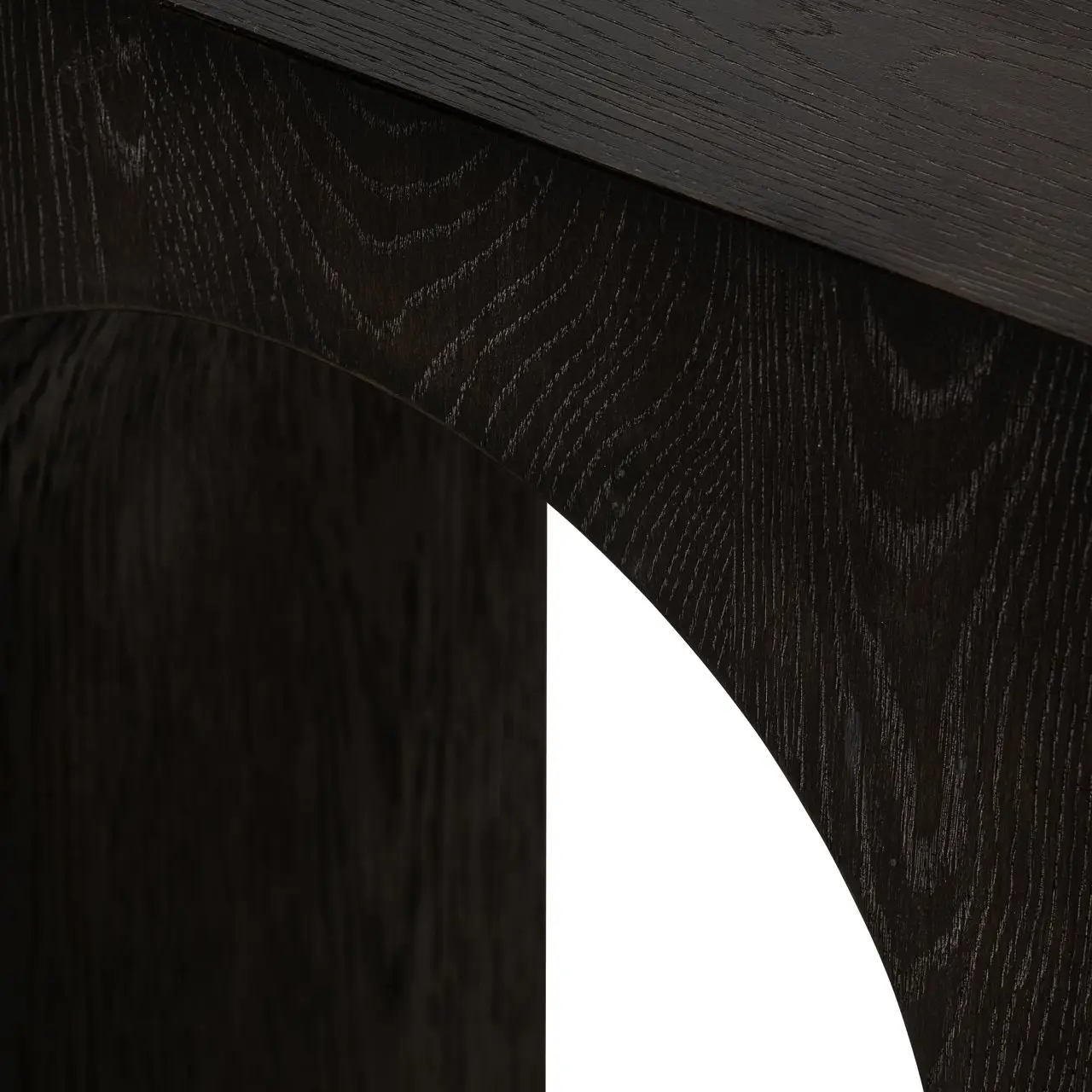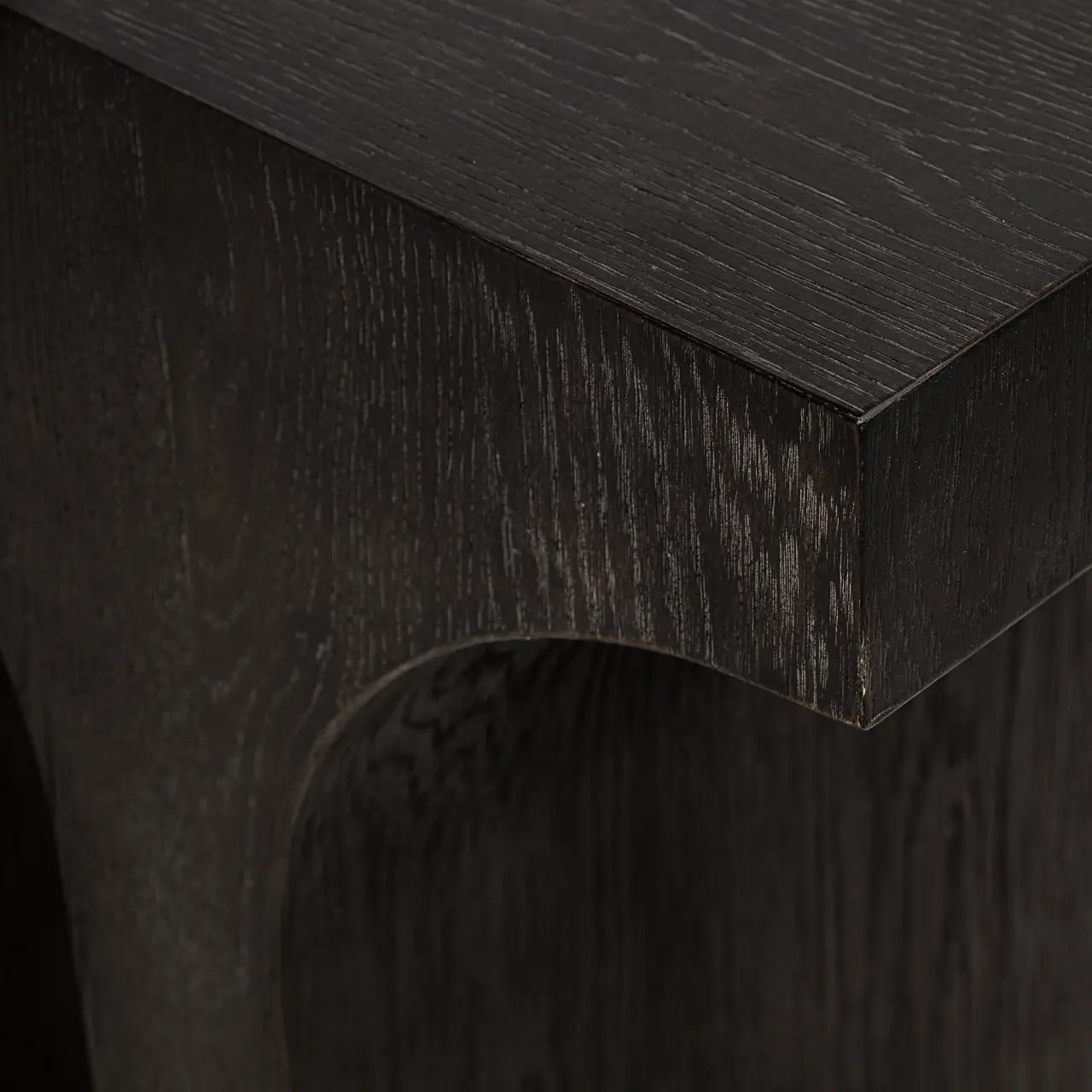 Console Ashford is afgewerkt in donker eikenfineer en heeft een opvallend sculpturaal onderstel. Een rijk statementstuk dat structuur en contrast brengt in de ruimte.