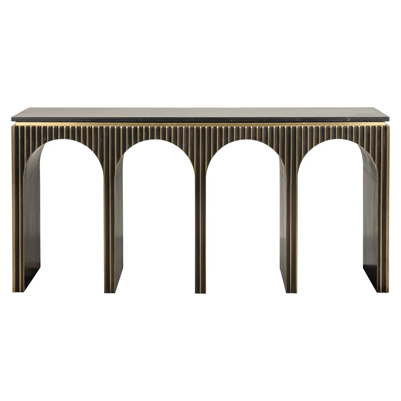De wandtafel Les Arcs combineert een opvallend ontwerp met luxe materialen, wat resulteert in een meubelstuk dat een statement maakt in elk interieur. Gemaakt van messing, marmer en MDF, straalt deze tafel zowel elegantie als robuustheid uit. De tafel heeft een prachtig geribbeld messing frame dat een boogmotief vormt, wat een speelse doch verfijnde uitstraling geeft. Het marmeren blad voegt een vleugje luxe toe, terwijl het stevige MDF zorgt voor duurzaamheid. De Les Arcs wandtafel is een veelzijdig stuk dat perfect past in zowel moderne als klassieke interieurs, ideaal als opvallend meubel in een hal, woonkamer of entree.