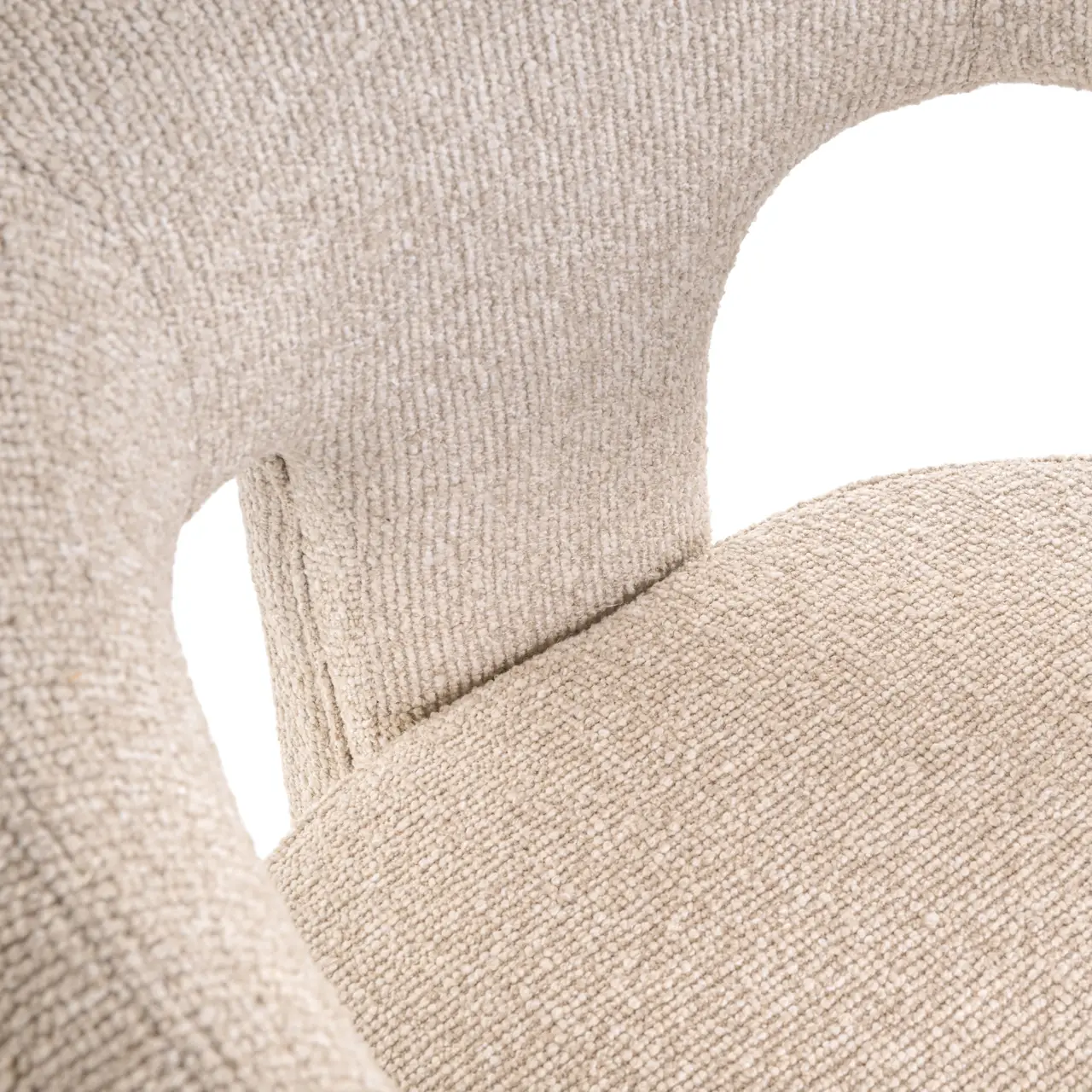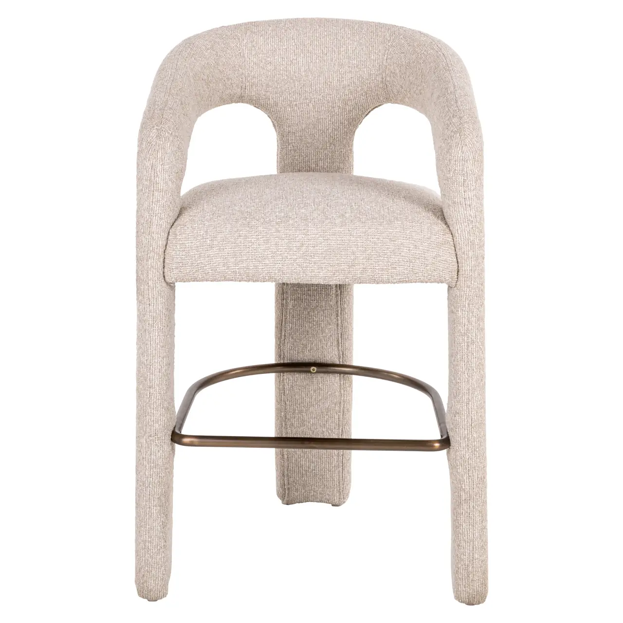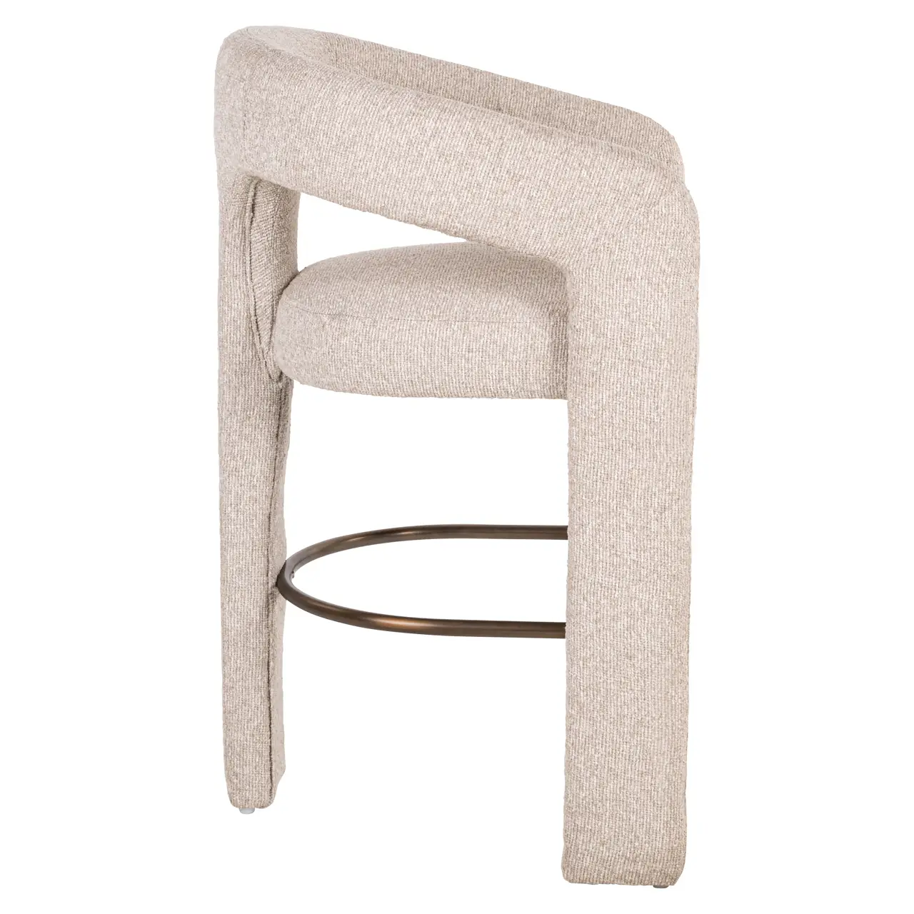 Deze counterkruk heeft een slanke, opstaande vorm met een rustige en evenwichtige uitstraling. De zitting en rugleuning zijn compact en licht afgerond, wat zorgt voor een comfortabele en ingetogen belijning. De bekleding toont een zachte, lichte kleurindruk met een matte textuur. Door het verfijnde ontwerp past de kruk goed aan een kookeiland of hoge tafel in een rustig interieur.