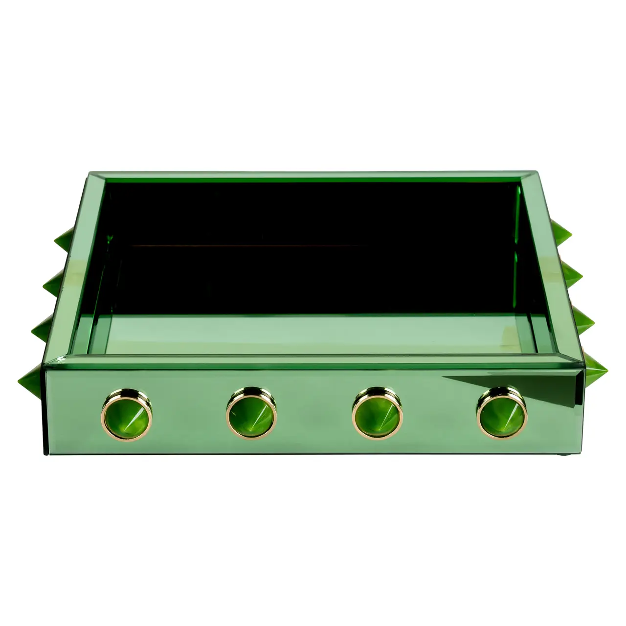Dienblad Jinx in groen is een stijlvol en opvallend accessoire dat luxe en moderniteit uitstraalt. Het glanzende groene oppervlak, gecombineerd met subtiele gouden accenten, geeft dit dienblad een chique en verfijnde uitstraling. De geometrische details aan de zijkanten voegen een eigentijds en gedurfd element toe, waardoor Jinx zowel functioneel als decoratief is. Perfect om drankjes of hapjes te serveren of om decoratieve items op tentoon te stellen. Met dienblad Jinx voeg je een vleugje glamour toe aan elke ruimte.
