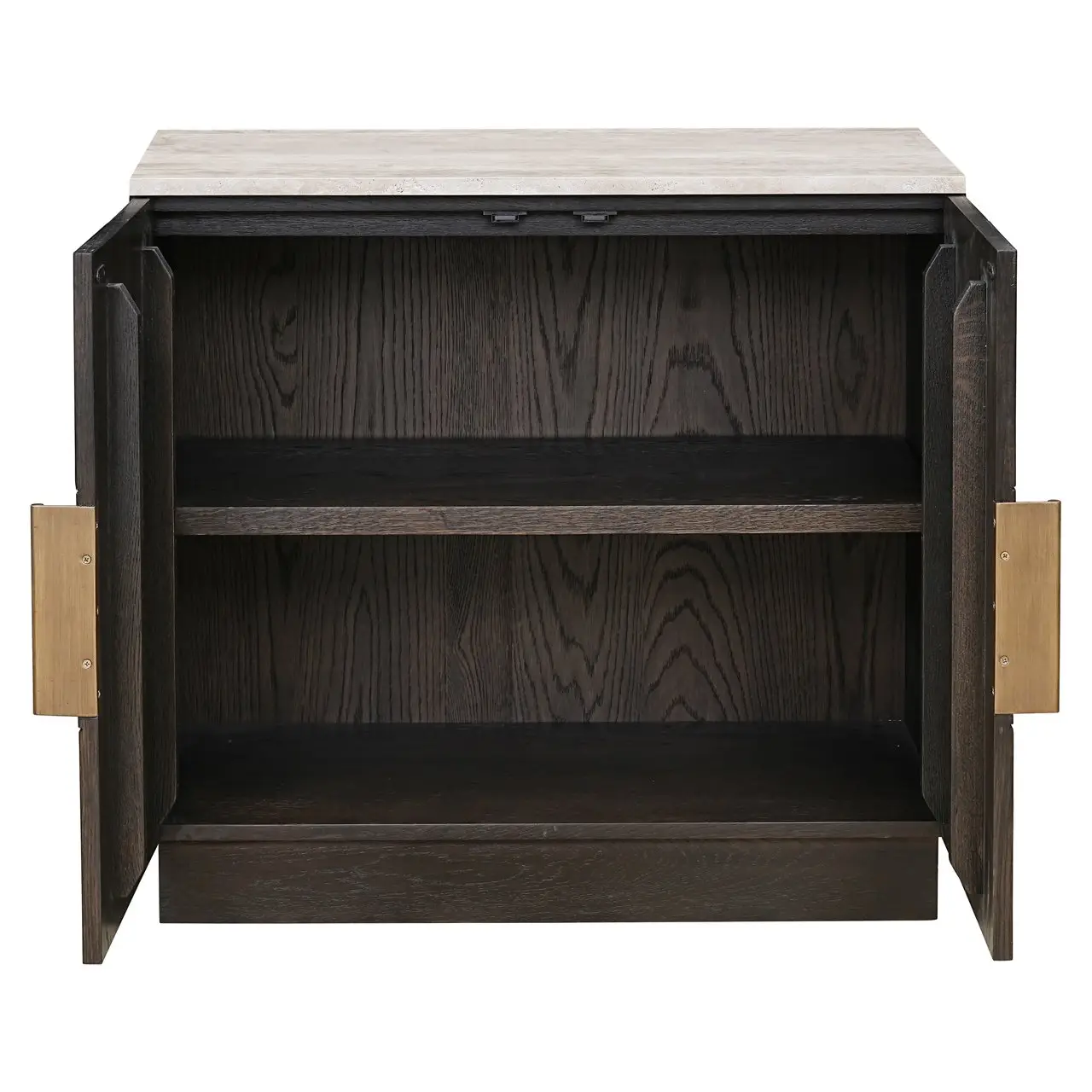 Het Claremont dressoir is vervaardigd uit eikenfineer, eikenhout, travertine en hout, wat zorgt voor een stevige en stijlvolle constructie. Het dressoir beschikt over twee deuren met een geometrisch patroon, wat een moderne en opvallende uitstraling geeft. Het bovenblad van steen voegt een luxueus en duurzaam element toe. Dit dressoir biedt praktische opbergruimte en is een perfecte combinatie van design en functionaliteit, geschikt voor diverse interieurstijlen.