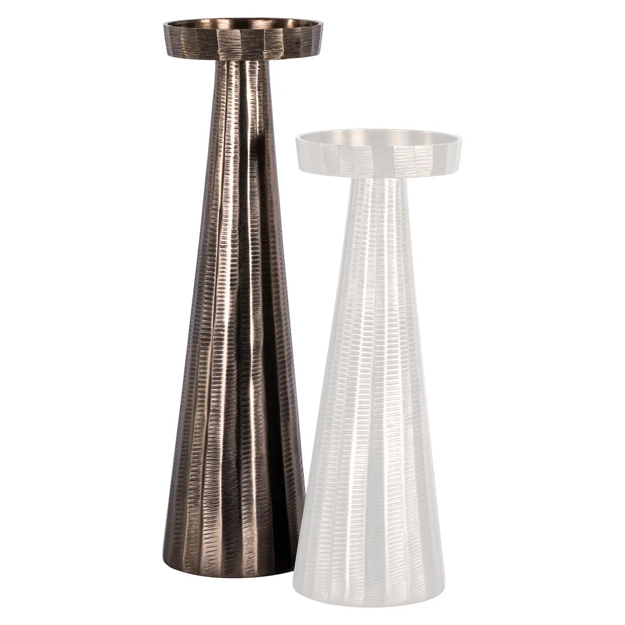 Deze kandelaar heeft een slanke verticale vorm met een stabiele basis. De afwerking toont een bronzen kleur met een subtiele glans, wat zorgt voor een warme uitstraling. Door de evenwichtige verhoudingen en het rustige ontwerp is dit object geschikt voor plaatsing op een tafel, dressoir of console.