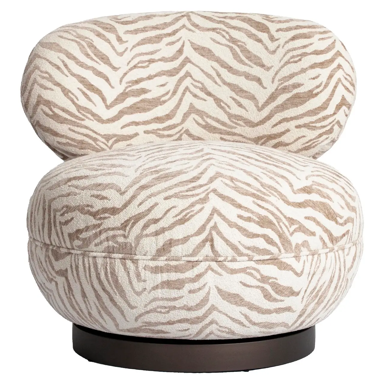 Een loungestoel met een uitgesproken karakter en speelse dynamiek. Het beige tiger dessin geeft het ontwerp een opvallende uitstraling, terwijl de draaifunctie zorgt voor extra flexibiliteit in gebruik. De comfortabele zit en zachte vormen maken dit model geschikt als statement piece binnen de ruimte.