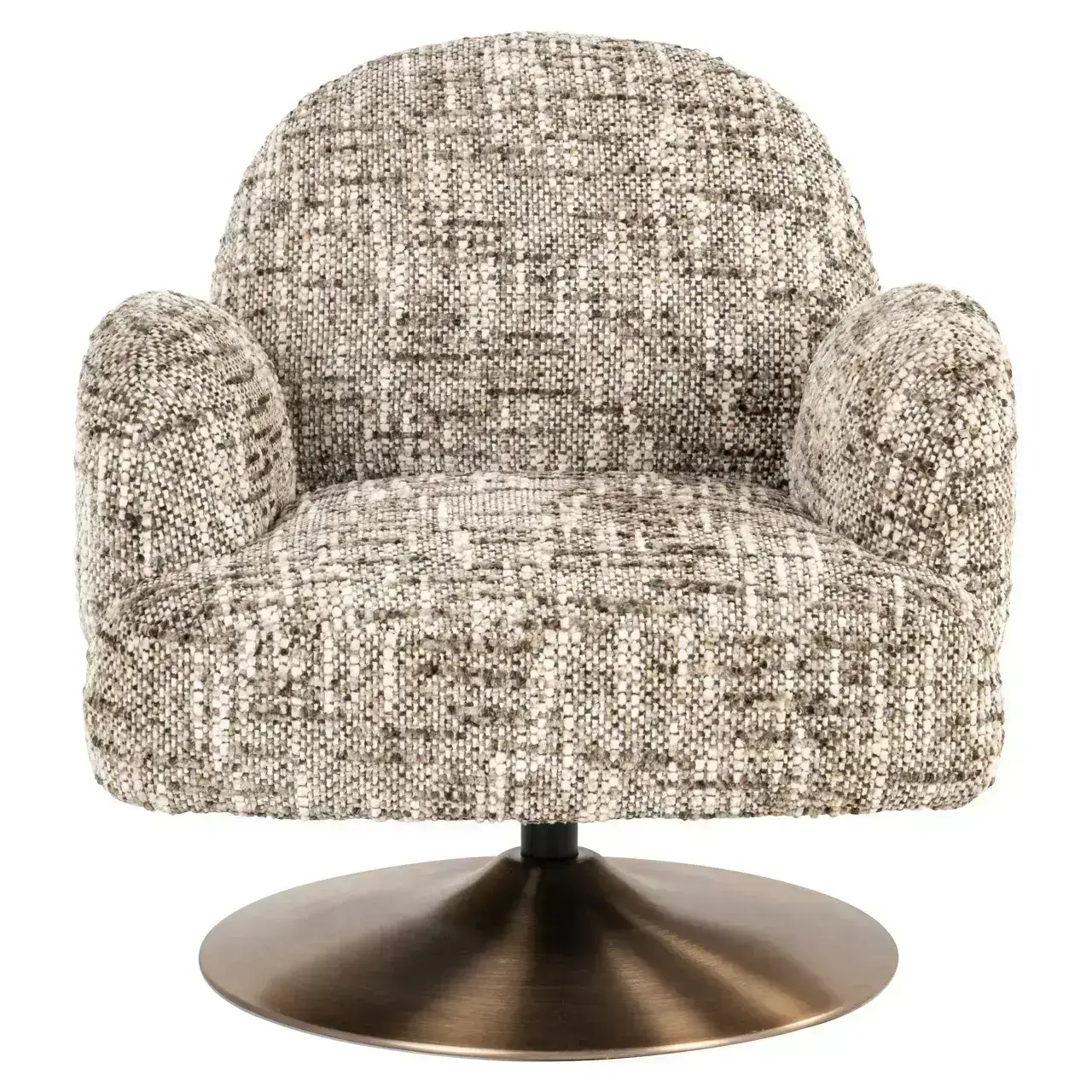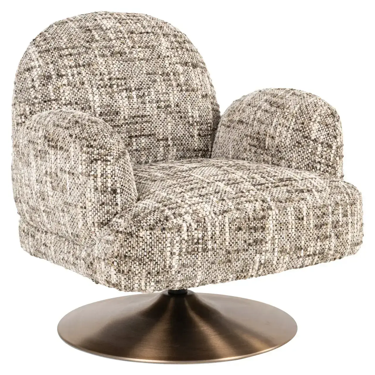 Fauteuil Kagney is een draaibare armstoel met vaste kussens en een zachte, uitnodigende vorm. Bekleed met Omara brown, ontworpen voor zowel comfort als loungen.
