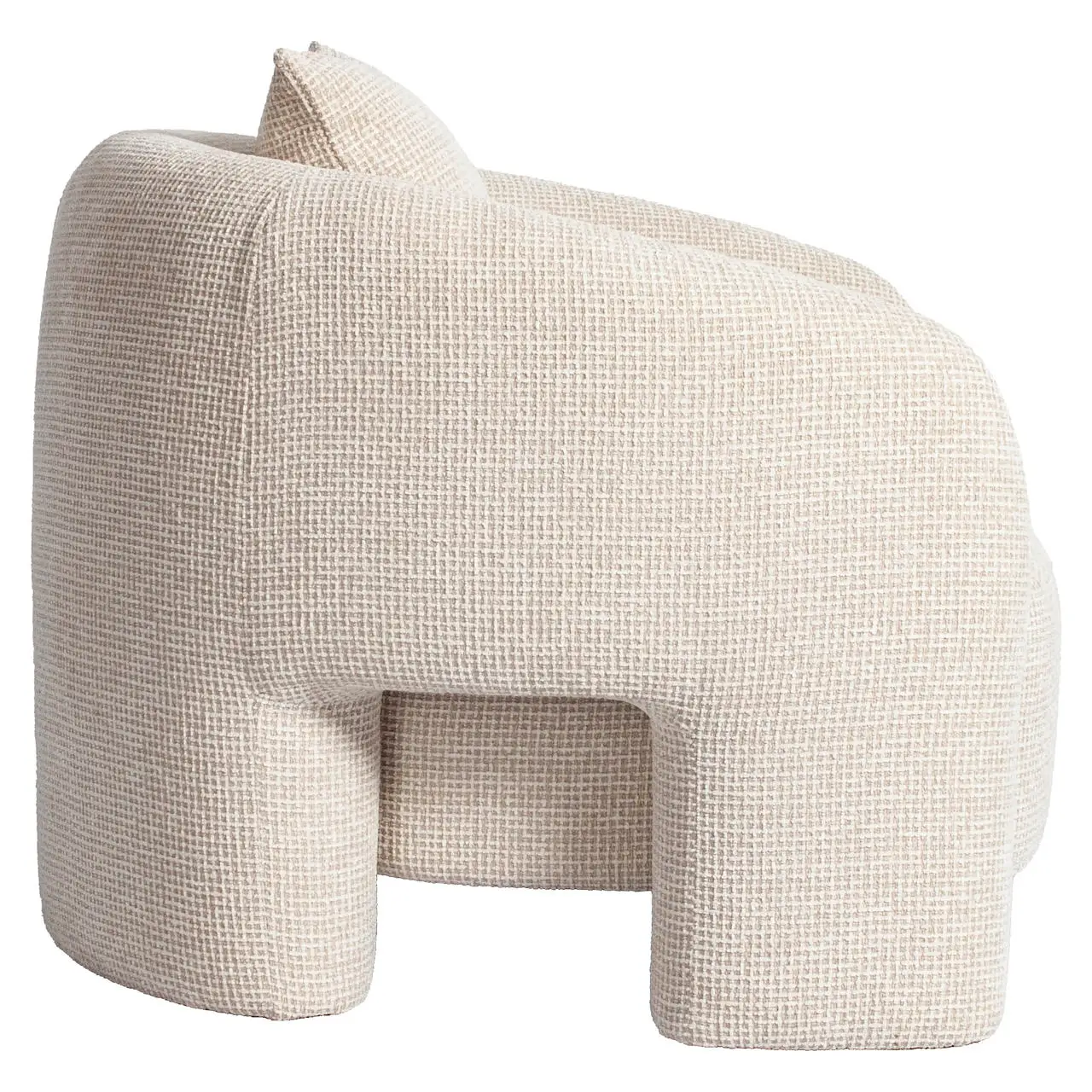 Een loungestoel met een rustige en verfijnde uitstraling. De beige blockweave bekleding zorgt voor een warme en tijdloze basis. De comfortabele vorm nodigt uit tot ontspannen zitten en maakt het model geschikt als subtiel accent binnen de ruimte.