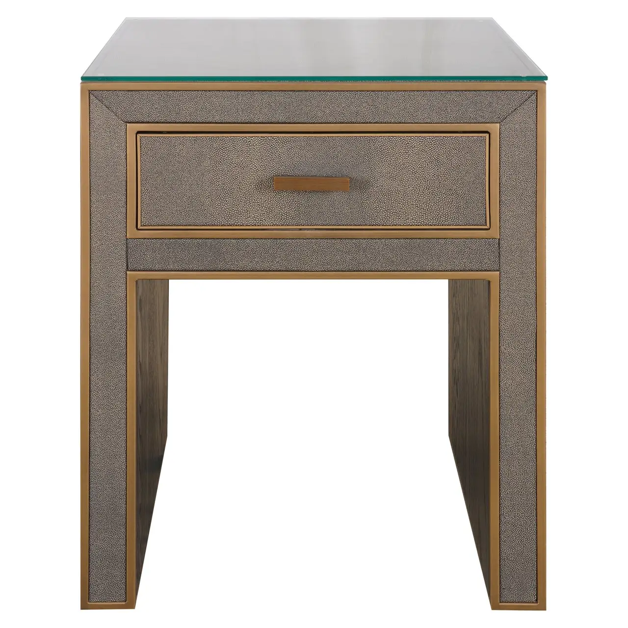 Het nachtkastje Bloomville met één lade straalt klasse uit door het gebruik van premium PU-leer, een glazen blad en verfijnde gouden details. Dit elegante ontwerp past perfect in een hotel chique slaapkamer en combineert praktische opbergruimte met een luxe uitstraling. De mix van rijke materialen en zachte texturen maakt dit nachtkastje een stijlvolle toevoeging naast ieder bed.