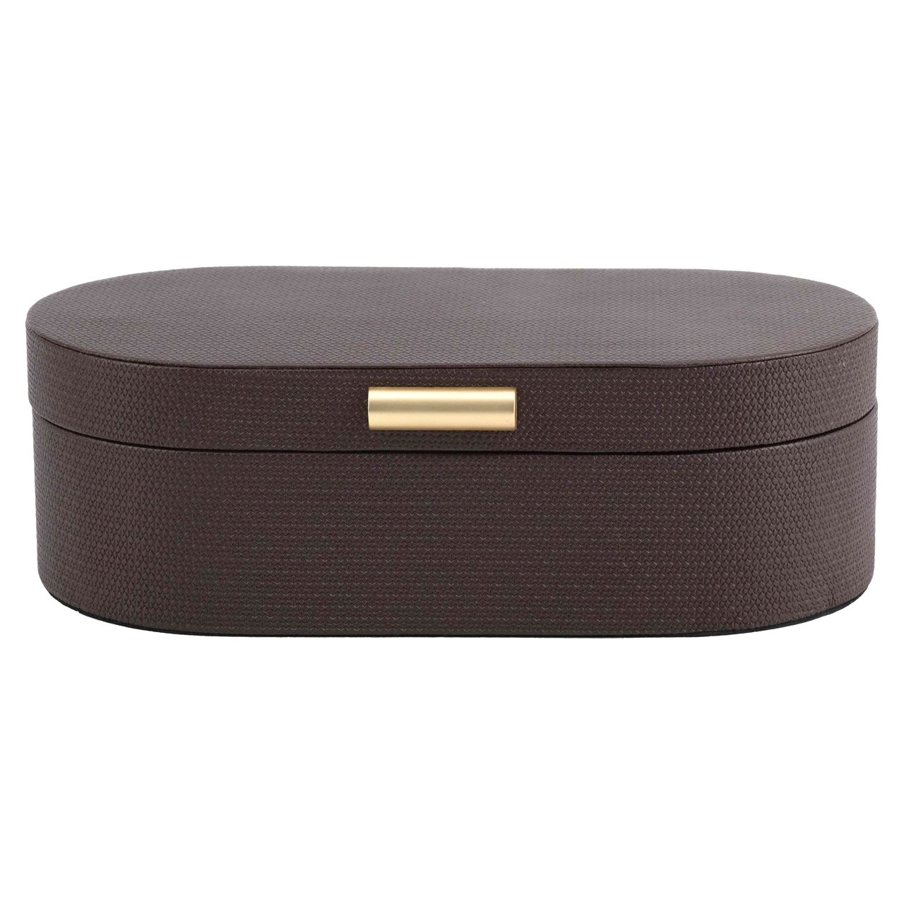 Een elegante opbergdoos die functionaliteit combineert met een warme, decoratieve uitstraling. De diepe bruine tint en verfijnde afwerking maken dit item tot een stijlvol accent in een kast, op een dressoir of op een salontafel. Ideaal voor het netjes opbergen van kleine accessoires terwijl het interieur een luxe uitstraling behoudt.