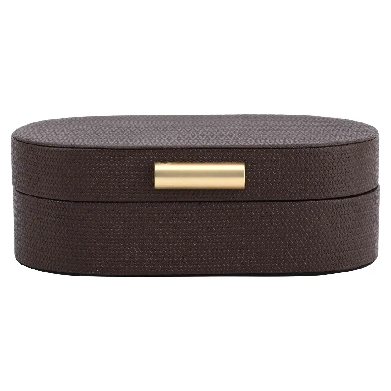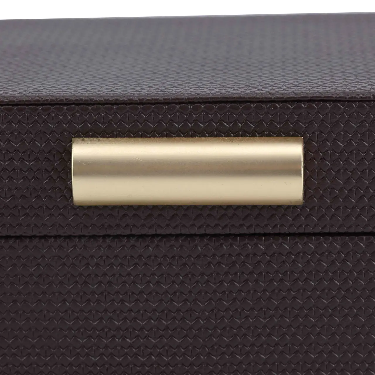 Een compacte opbergdoos met een verfijnde uitstraling en een warme bruine kleur. Het subtiele ontwerp maakt dit item zowel praktisch als decoratief in een modern interieur. Perfect voor het opbergen van kleine spullen terwijl het tegelijkertijd een stijlvolle toevoeging vormt.