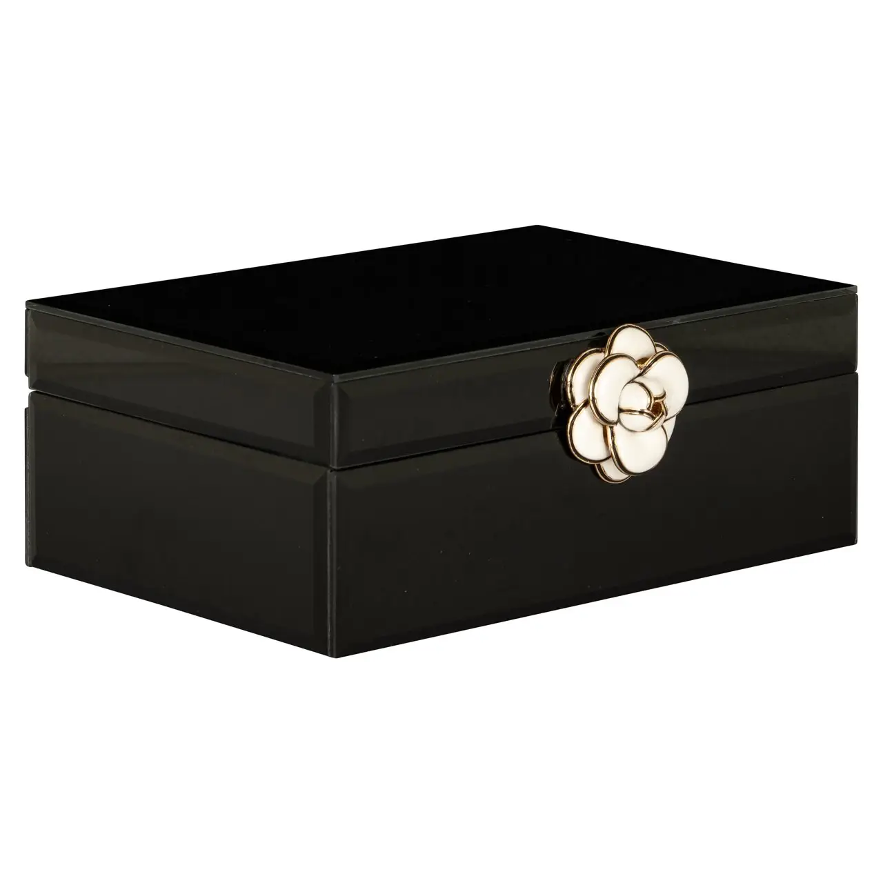 Juwelen box Vivy klein presenteert zich als een elegant opbergsysteem voor uw kostbaarheden. De diepe zwarte kleur van de box wordt verfraaid met subtiele gouden details die een vleugje luxe toevoegen. Deze box is niet alleen praktisch voor het veilig bewaren van uw sieraden, maar fungeert ook als een stijlvol decoratief element op uw kaptafel of nachtkastje.