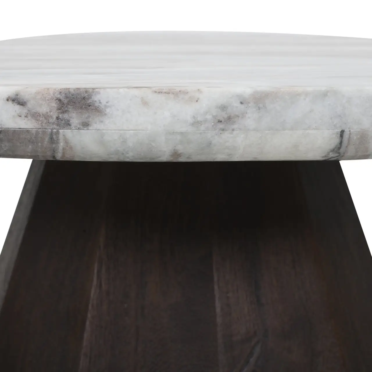 De salontafel Oberoy (80 cm) is een verfijnde ronde tafel met een luxe uitstraling, dankzij het blad van Toronto marmer en de stevige voet van mangohout. De combinatie van natuurlijke materialen en elegante vormen maakt deze tafel tot een stijlvolle blikvanger in de zithoek. Perfect voor wie houdt van een warme, chique sfeer in huis.