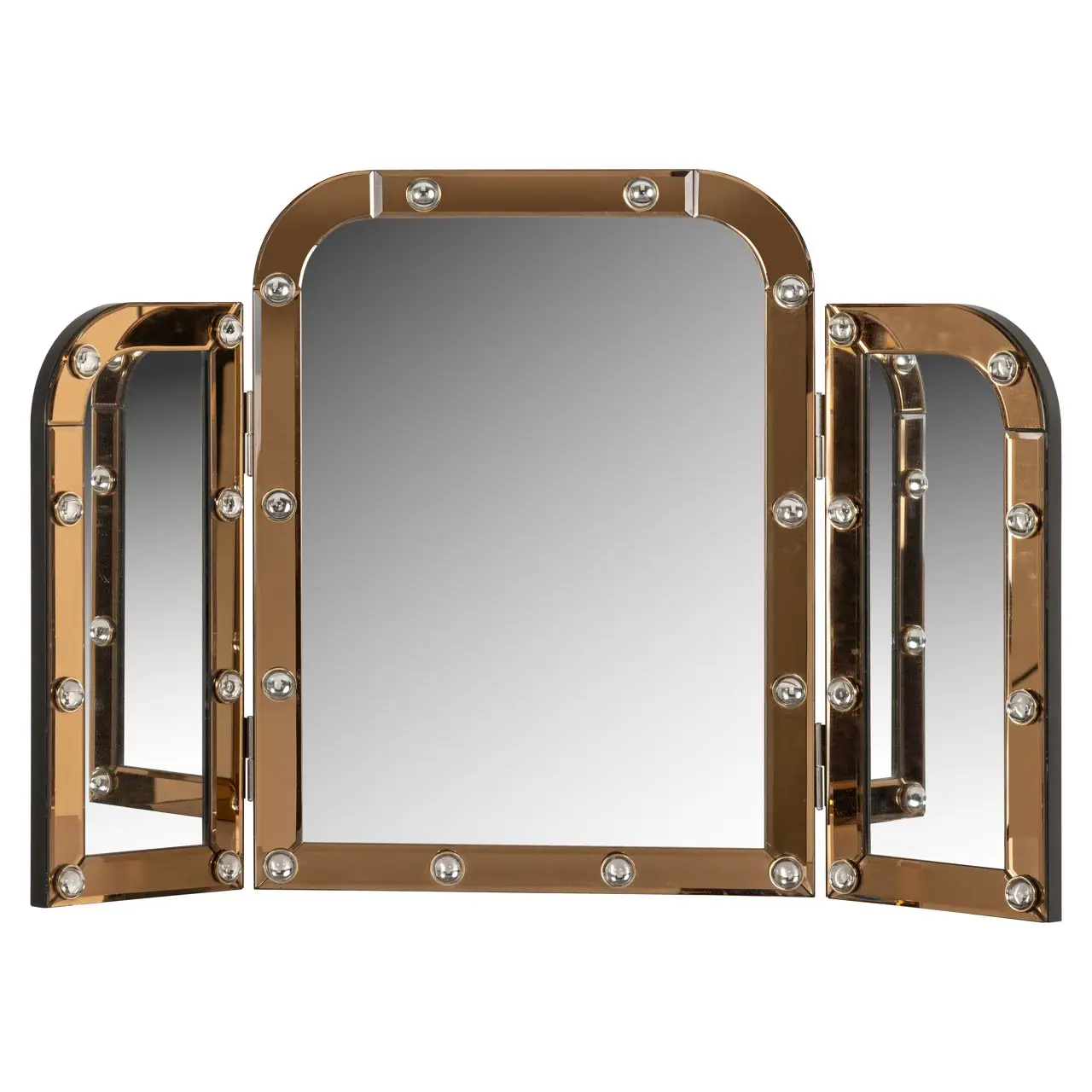 De tafelspiegel Jaira is een stijlvolle en functionele toevoeging aan je make-up of kaptafel. Met zijn elegante drieledige ontwerp en goudkleurige omlijsting biedt Jaira een klassieke uitstraling met een moderne twist. De spiegel is versierd met subtiele decoratieve elementen die de rand omlijsten, wat een vleugje luxe toevoegt aan het geheel. Dankzij het opvouwbare ontwerp kun je de zijpanelen eenvoudig aanpassen voor een optimale hoek, waardoor Jaira niet alleen mooi, maar ook praktisch is. Deze spiegel is perfect voor dagelijks gebruik en voegt een verfijnd accent toe aan je interieur.