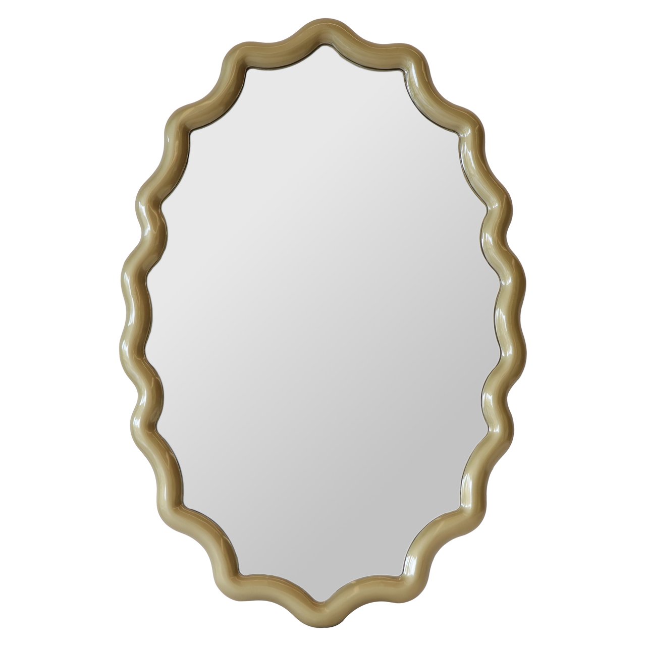 Deze spiegel heeft een afgeronde vorm met een omlijsting in een zachte goudtint. De rand oogt glad en verfijnd en geeft de spiegel een rustige uitstraling. Door de subtiele kleur en het evenwichtige ontwerp past hij zowel in moderne als klassiekere interieurs. De spiegel combineert functionaliteit met een versterkend effect op de ruimtelijke beleving.
