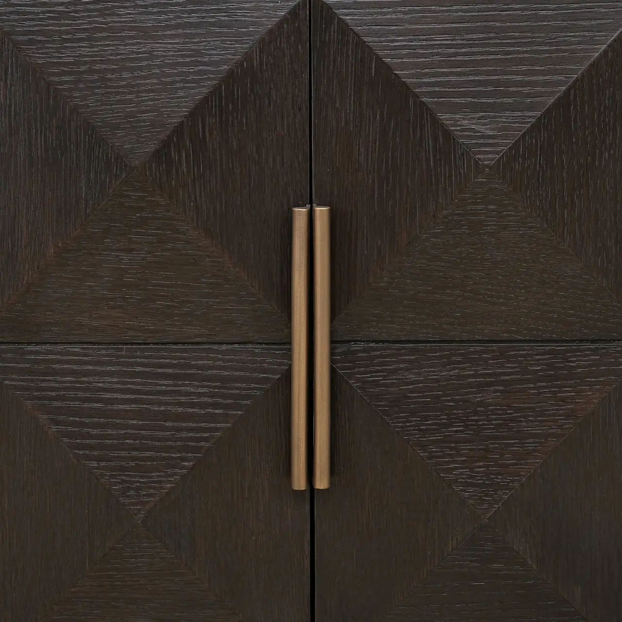 Het Claremont TV-dressoir is gemaakt van eikenfineer, eikenhout, travertine en hout, wat zorgt voor een robuuste en elegante uitstraling. Het dressoir heeft vier deuren met een geometrisch patroon dat het meubel een moderne en opvallende uitstraling geeft. Het bovenblad van steen biedt een stevig oppervlak dat zowel functioneel als stijlvol is. Dit dressoir biedt ruime opbergmogelijkheden en is een perfecte combinatie van design en functionaliteit in je woonkamer.