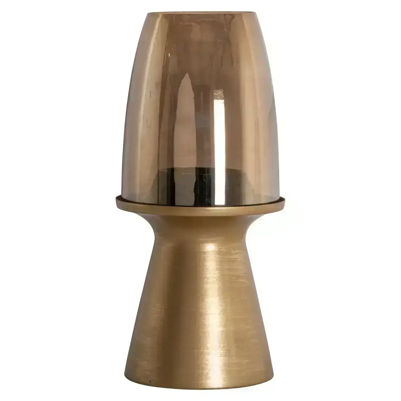 Windlicht Danea small heeft dezelfde elegante uitstraling in een compact formaat. Met zijn gouden basis en glazen kap is hij perfect op een console of salontafel.